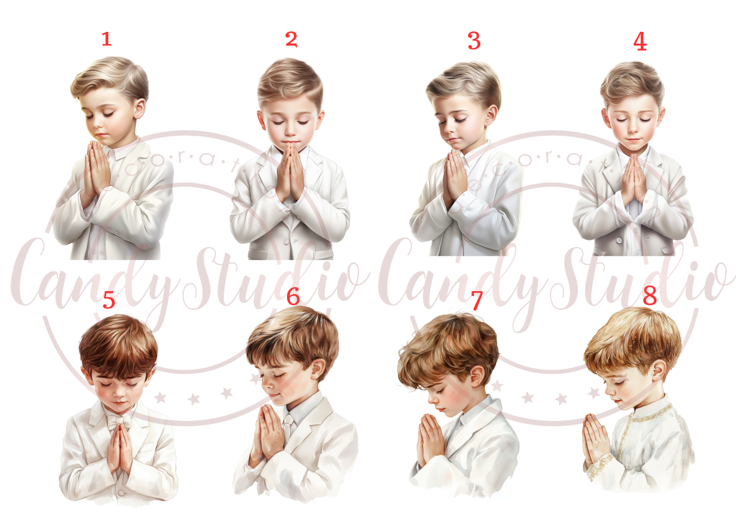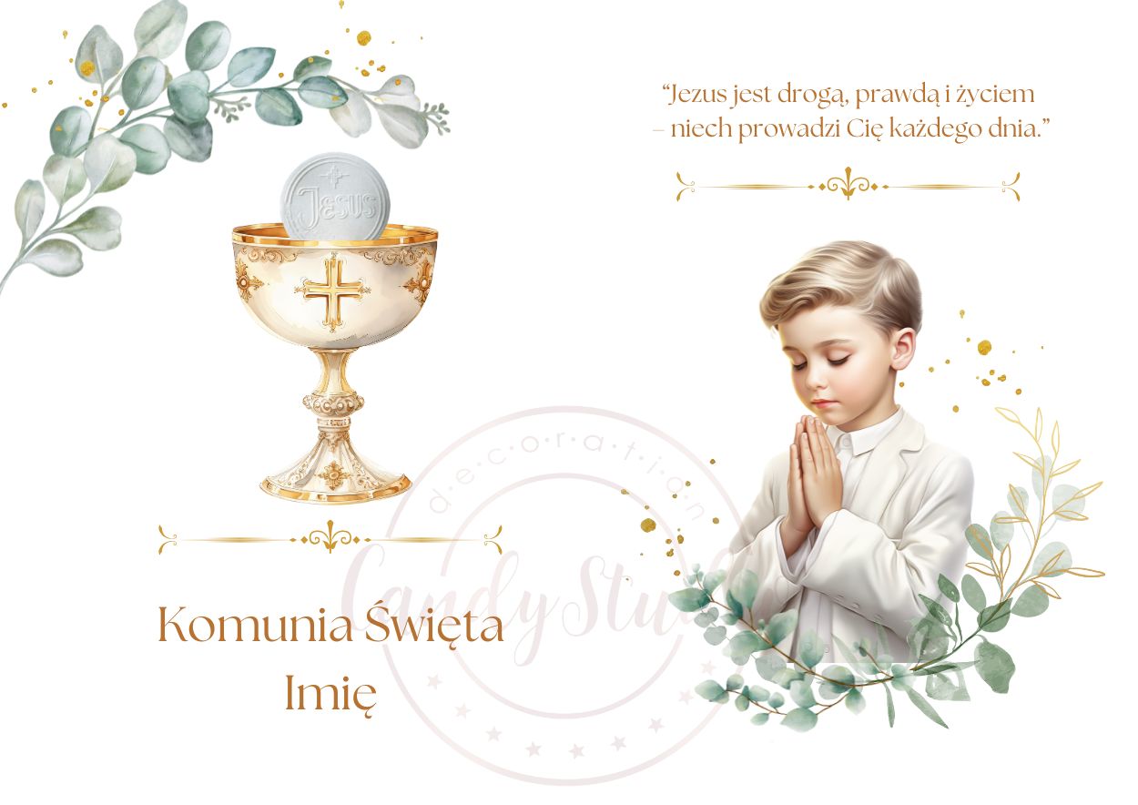 Personalisierter essbarer Tortenaufleger zur Kommunion für Jungen, mit betendem Jungen (8 Motive zur Auswahl), eucharistischem Kelch, Eukalyptuszweigen & Zitat. Druck im A4-Querformat, wählbar in Deutsch oder Polnisch. Falls eine individuelle Anpassung (Hautfarbe, Frisur etc.) gewünscht ist, kontaktiere uns per E-Mail oder Messenger. Erhältlich auf Esspapier für Butterkreme, Esspapier für Sahnekreme oder Oblatenpapier.