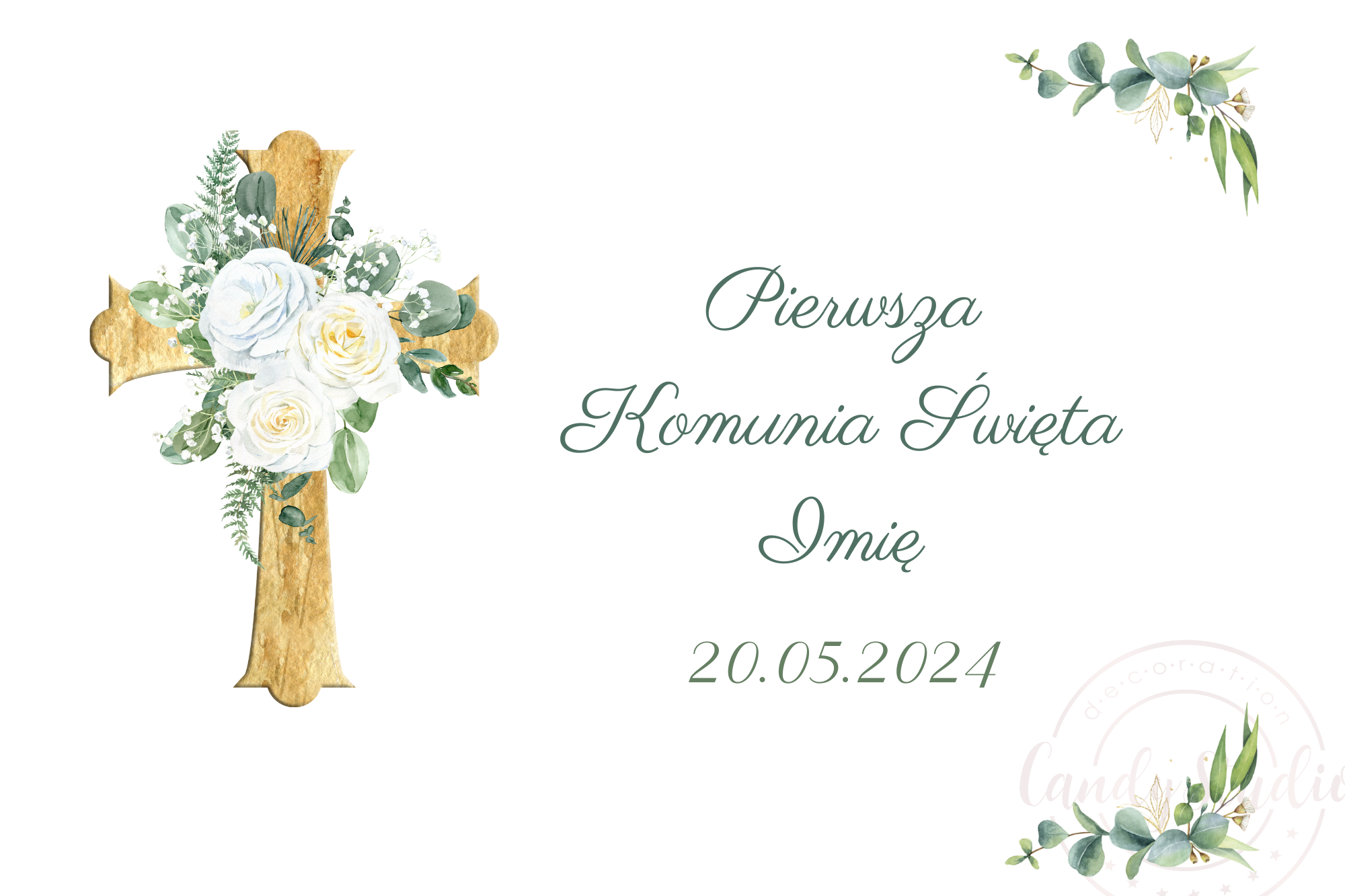 Verleihen Sie Ihrer Kommunionsfeier eine persönliche Note mit unserem essbaren Tortenaufleger, der die Schönheit von weißen Rosen und Eukalyptusblättern mit individueller Personalisierung vereint.